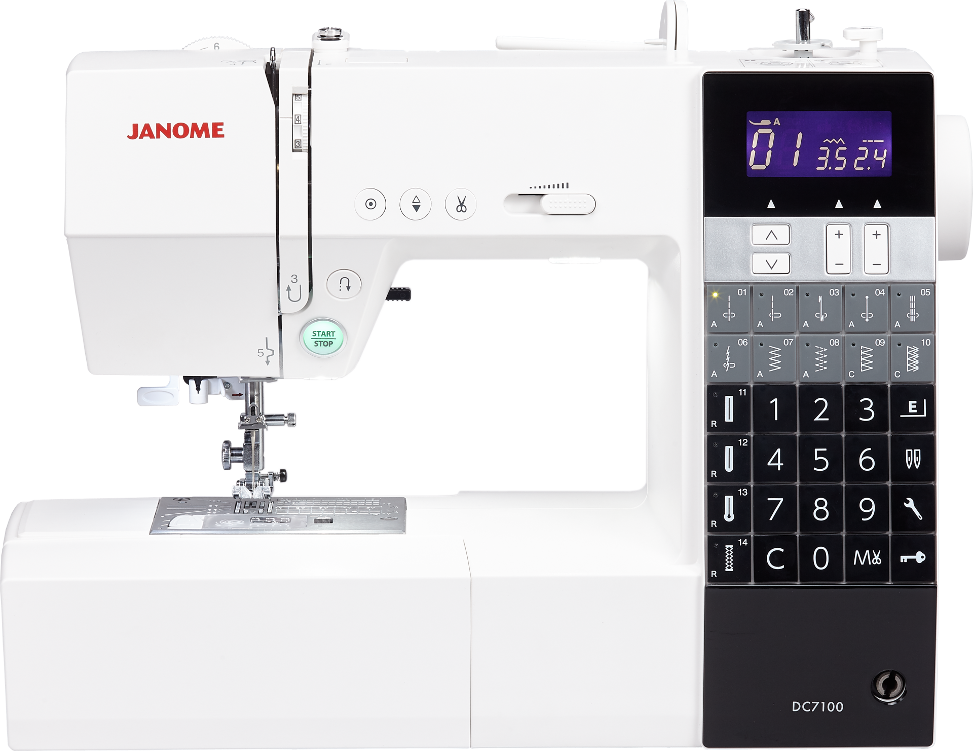 Die Computernähmaschine DC7100 bietet den Hobbynäherinnen viel Komfort zu einem vernünftigen Preis. Mit dem übersichtlichen LC Display lassen sich Stiche abrufen und bei Bedarf individuell verändern. 14 Direkttasten erlauben schnellen Zugriff auf 10 beliebte Stiche und vier Knopflöcher. Insgesamt sind 100 Stiche programmiert. Eine steckbare Übersicht führt schnell zum Stich. Mit dem Einfädler und der neuen Spulenschnelleinlage ist die DC7100 in Kürze nähbereit. Funktionen wie Nadelstopp oben/unten, Punktvernähen und elektronische Fadenschere gehören neben der Start/Stopp-Taste und der stufenlosen Regulierung der Nähgeschwindigkeit ebenso zu den Annehmlichkeiten wie die Zwillingsnadelkontrolle und eine Elongation-Wahltaste. Die Schere ist übrigens programmierbar. So schneidet die Nähmaschine nach dem Vernähen automatisch ab. Mit der Nähmaschine kommt reichhaltiges Zubehör sowie ein Kniehebel und ein großer Anschiebetisch. So macht mit der DC7100 das Nähen noch mehr Spaß.