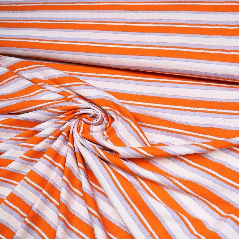Bi-elastischer Viskosejersey mit Querstreifen in weiß, orange, grau und silber.