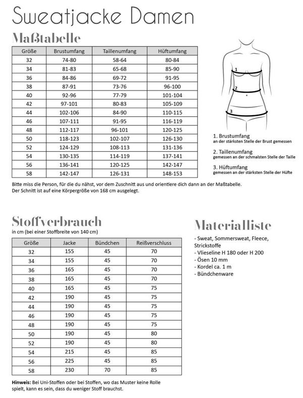 Papierschnittmuster Sweatjacke Damen, Größe 32 – 58.