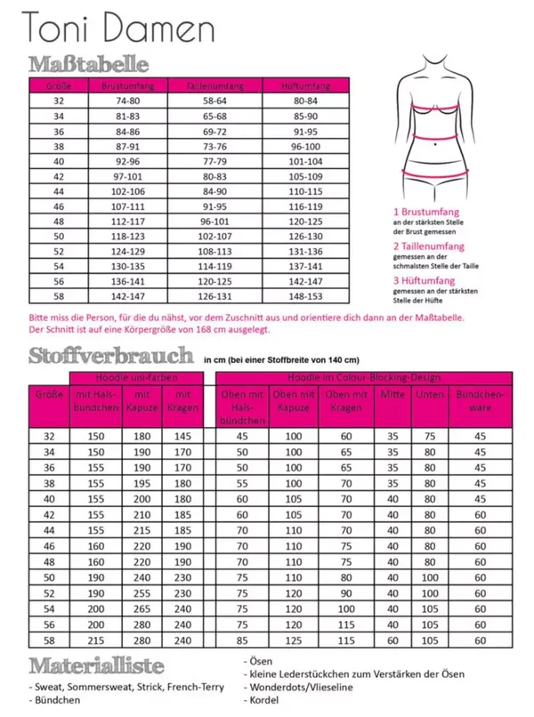 Papierschnittmuster Hoodie Toni Damen,Größe 32-58