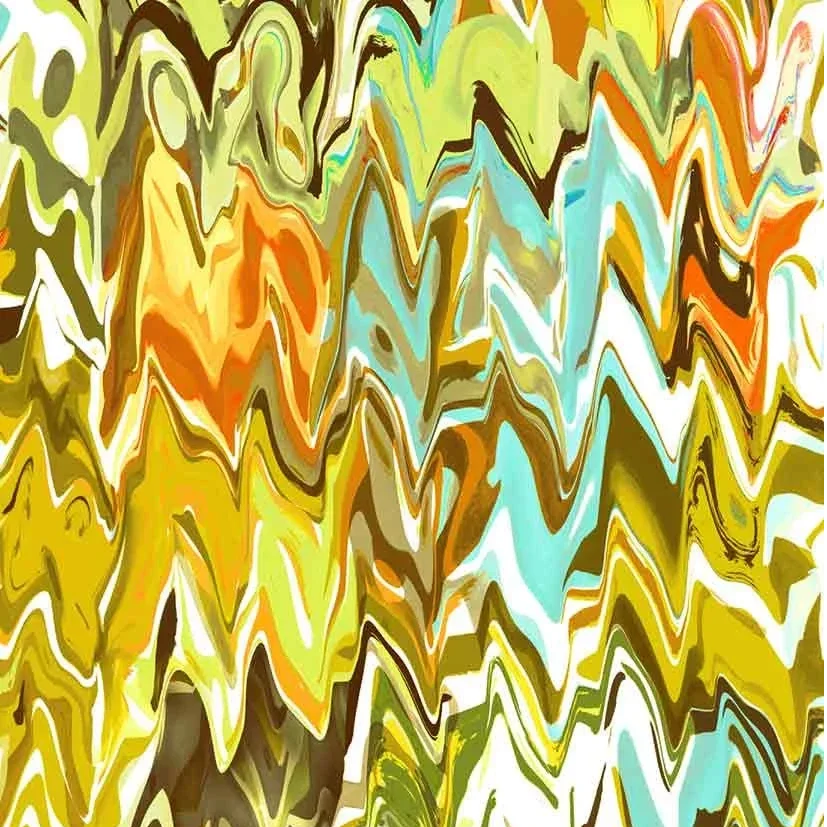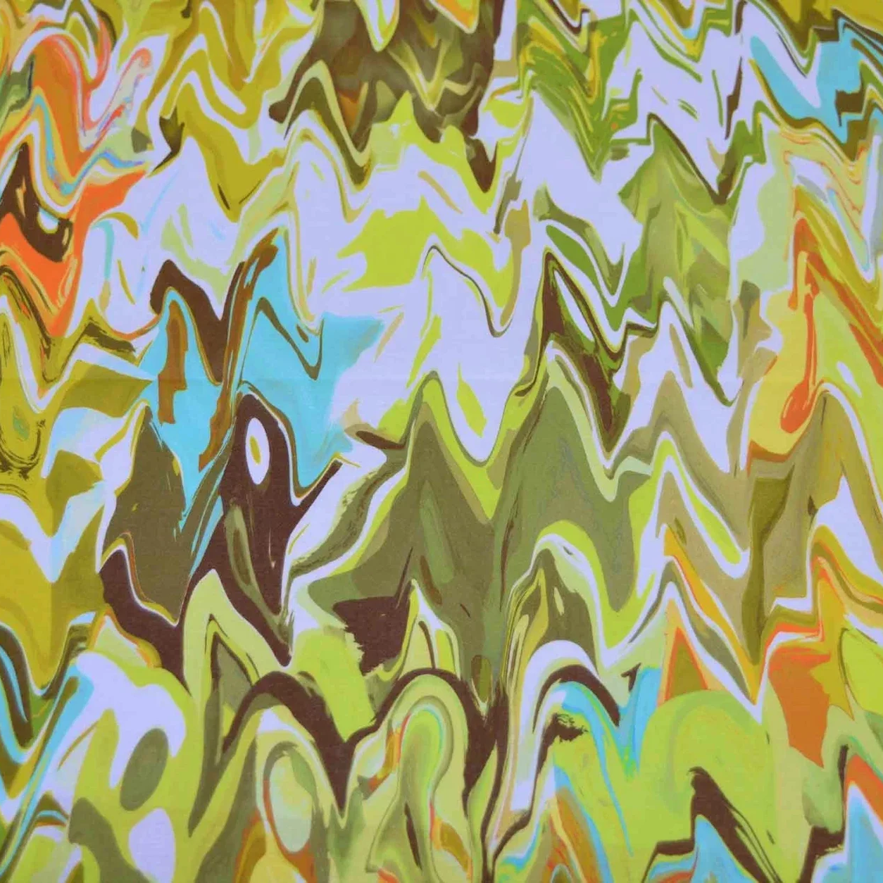 Weißgrundiger Stoff. Die Oberfläche ist matt und mit bunten Schlieren in vorwiegend Grün- und Brauntönen bedruckt.