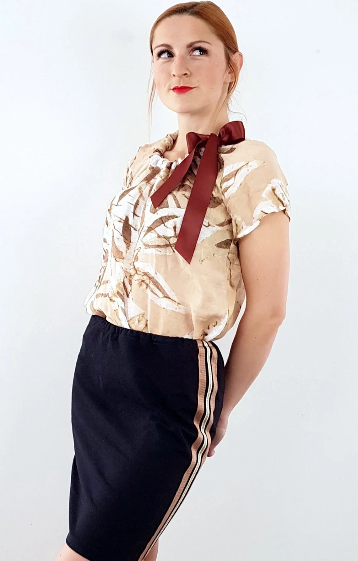 Eine Bluse mit Rundhalsausschnitt und optionaler Schleife. Du kannst Elo mit kurzen, dreiviertel oder langen Armen nähen.