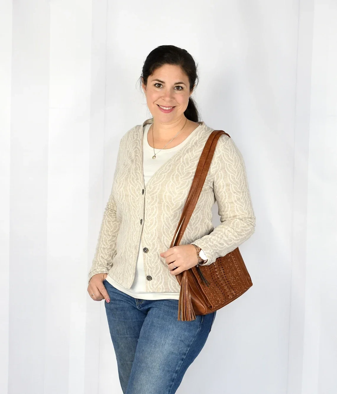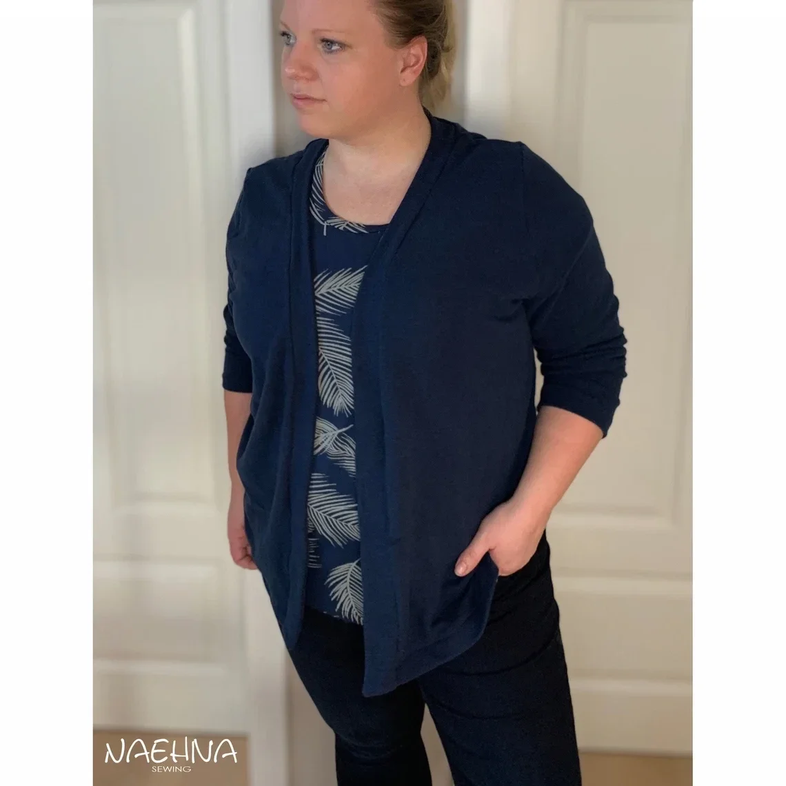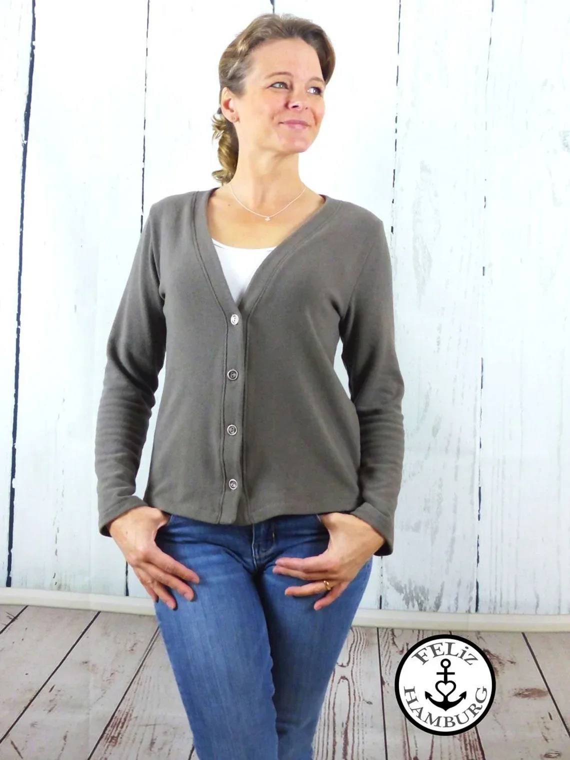 Die lillesol women No.59 Basic-Strickjacke ist eine klassisch geschnittene Jacke mit Knopfleiste. Die Strickjacke kann mit oder ohne Saumbündchen genäht werden. Sie sitzt leicht tailliert und ist eher schmal geschnitten. Die Jacke eignet sich besonders schön für leichte Strickstoffe, kann aber auch aus anderen elastischen Stoffen genäht werden.