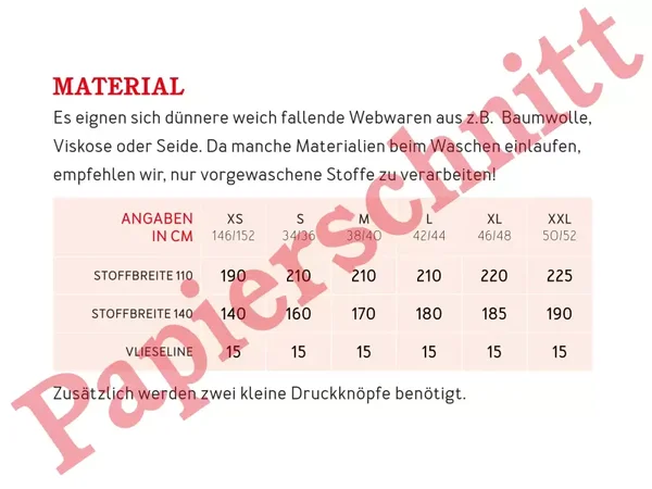 - Materialempfehlung: dünnere weich fallende Webwaren aus z.B. Baumwolle, Viskose oder Seide