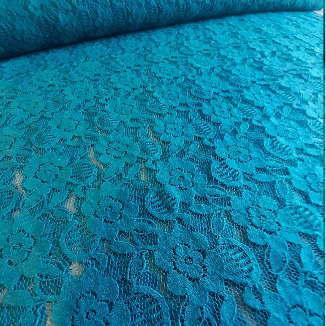 Transparenter Spitzenstoff in knalligem türkis mit Blumenmuster und verwendbarem Rand an der Seite ( siehe Bilder). "Lace" von Swafing.