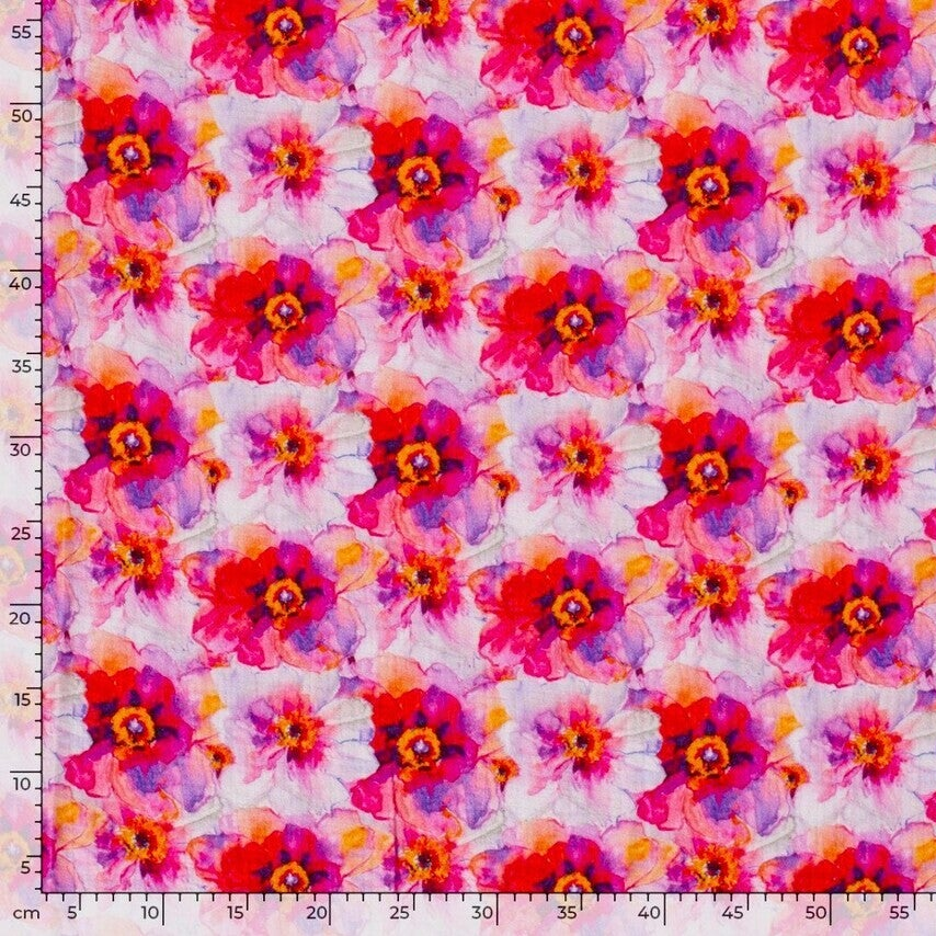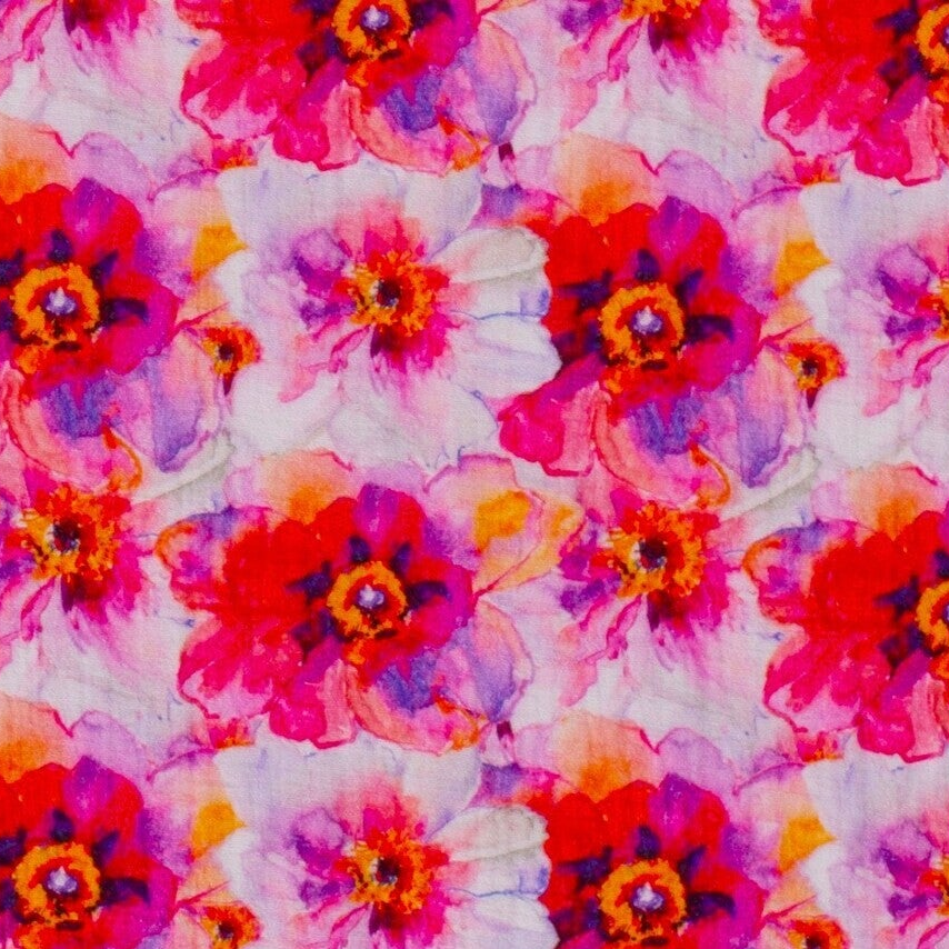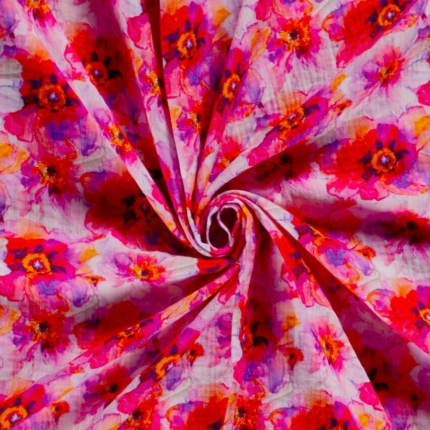 Musselinstoff mit Blüten in Rosa-, Pink-, Lila- und Orangetönen.