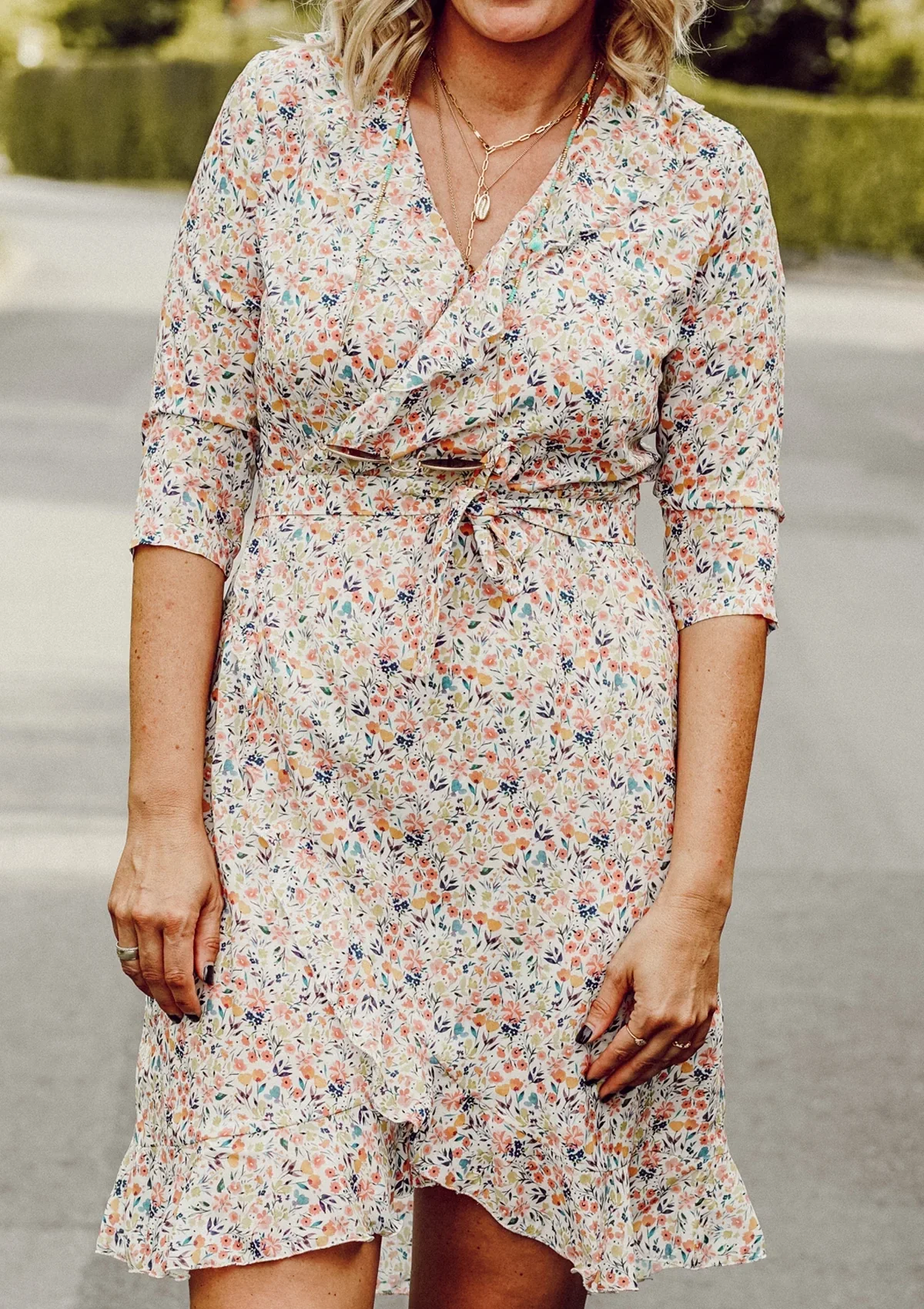 Die Volants am Saum und an den Ausschnittkanten verleihen dem Kleid eine romantische, verspielte Optik. Fenja endet kurz über dem Knie und hat einen Drei-Viertelärmel.