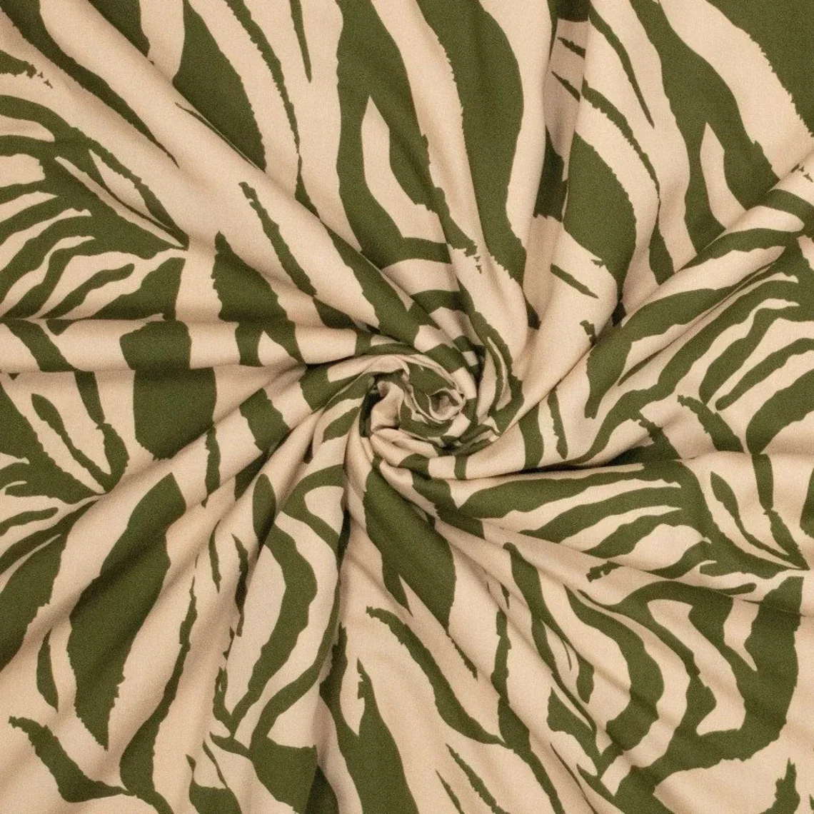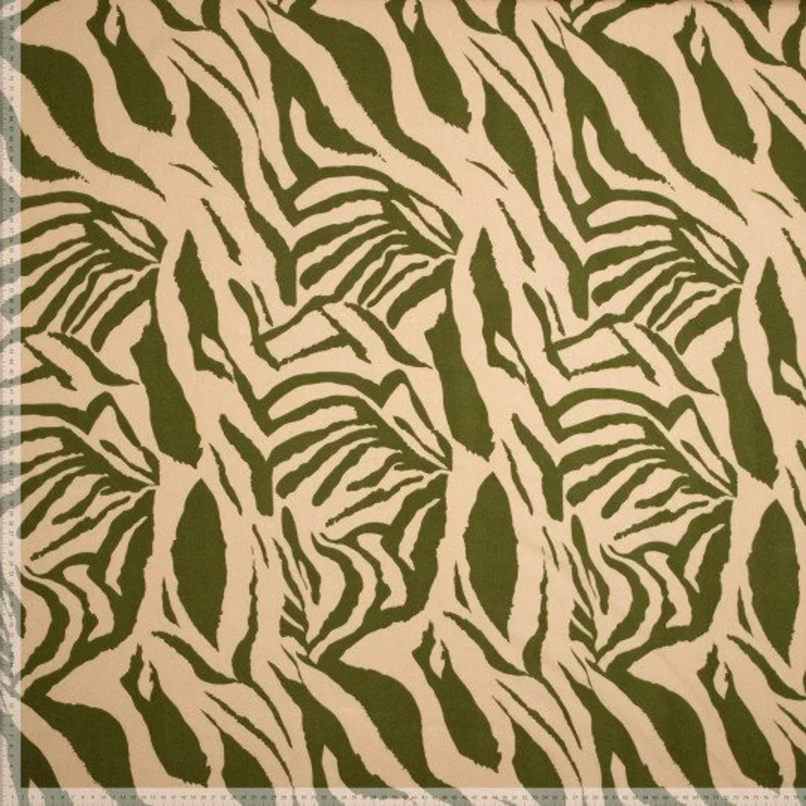 Viskosestoff mit Zebramuster in beige und olivgrün.