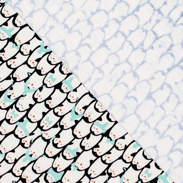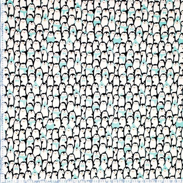 Cremegrundiger, angerauter Sweatstoff mit Pinguinen in schwarz und blau-türkis.