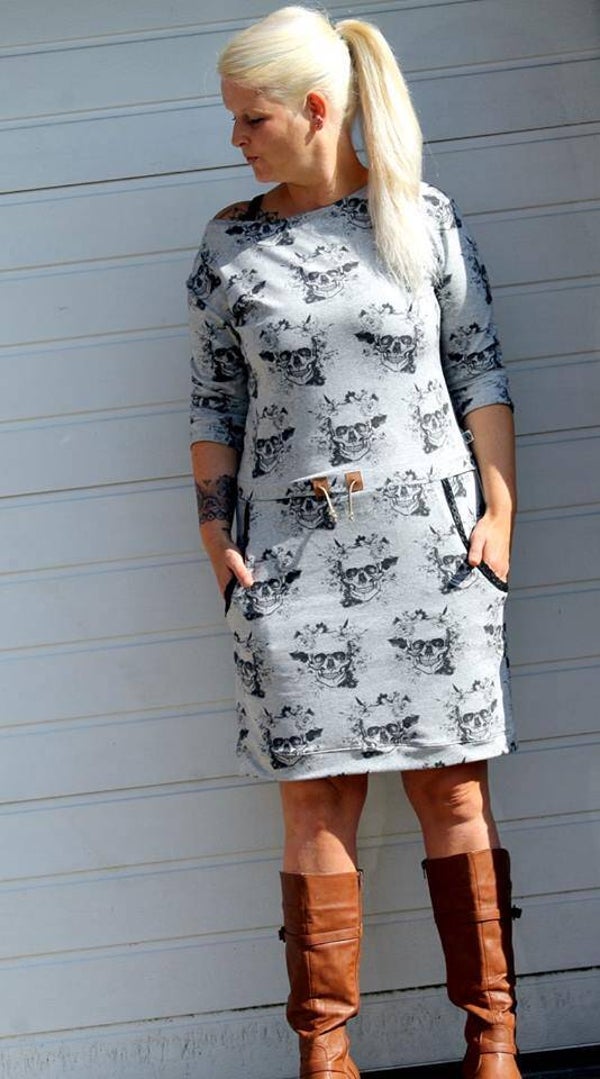 Dieser Schnitt beinhaltet die Anleitung und die Schnittteile, um dir ein lässiges Kleid mit leicht überschnittenen Ärmeln aus Sweat oder Jersey zu nähen, das je nach Stoffauswahl auch elegant daherkommen kann.