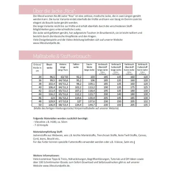 Schnittmuster Jacke "Rica" lillesol women No.88, Größe 34-50