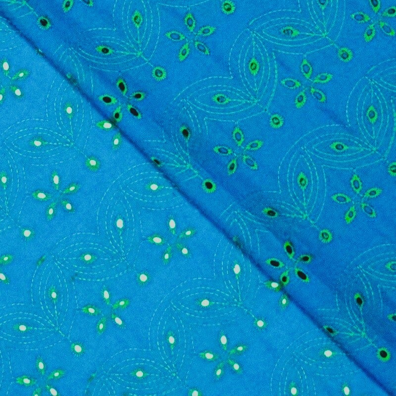 Blaue Baumwollpopeline mit grüner Lochstickerei.