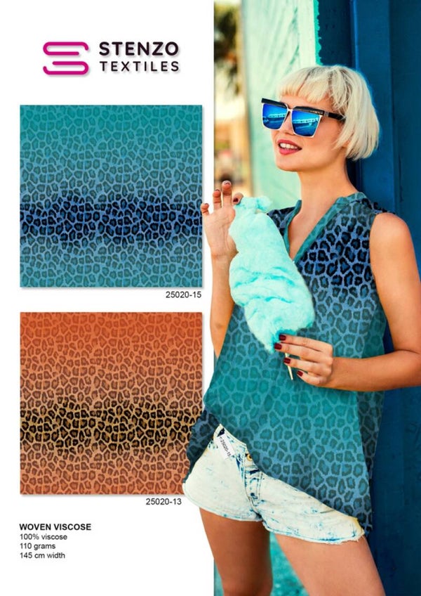 Viskosestoff mit braunem und orangenem Leopardenmuster im Farbverlauf.