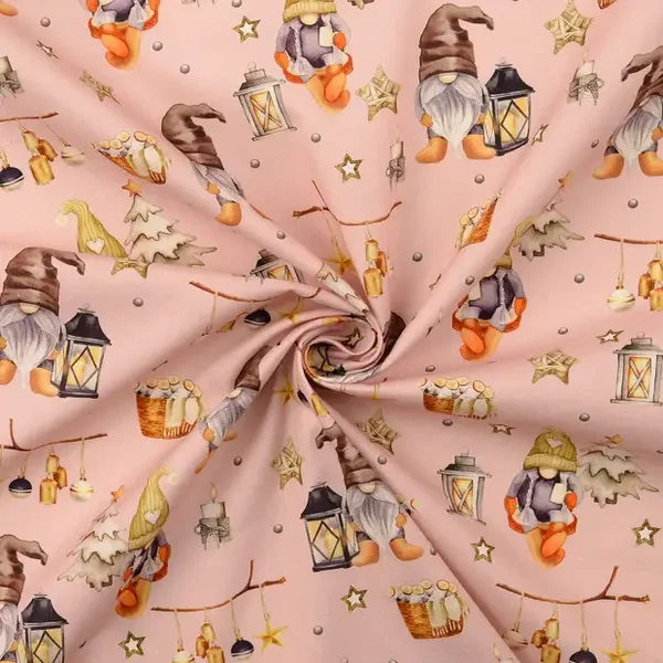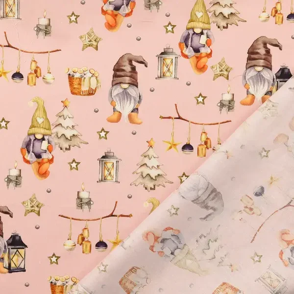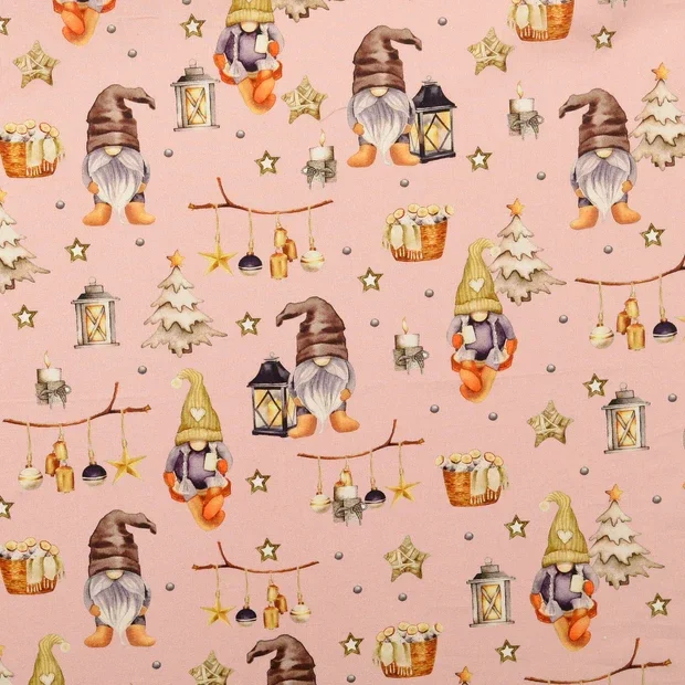 Rosagrundiger Baumwollstoff mit Wichteln, Kerzen, Weihnachtsbäumen, Sternen und weiteren weihnachtlichen Motiven.