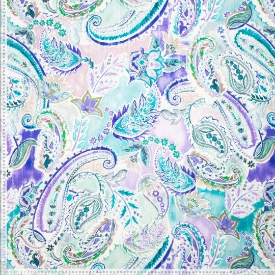 Die leichte, gewebte Viskose „Paisley“ vereint Eleganz und sommerliches Boho-Flair. Der digitale Paisley-Print besticht durch feinen Glanz dank eines kleinen Metallfaseranteils und detailreiche Motive, während die Viskose für einen weichen, atmungsaktiven Fall sorgt.