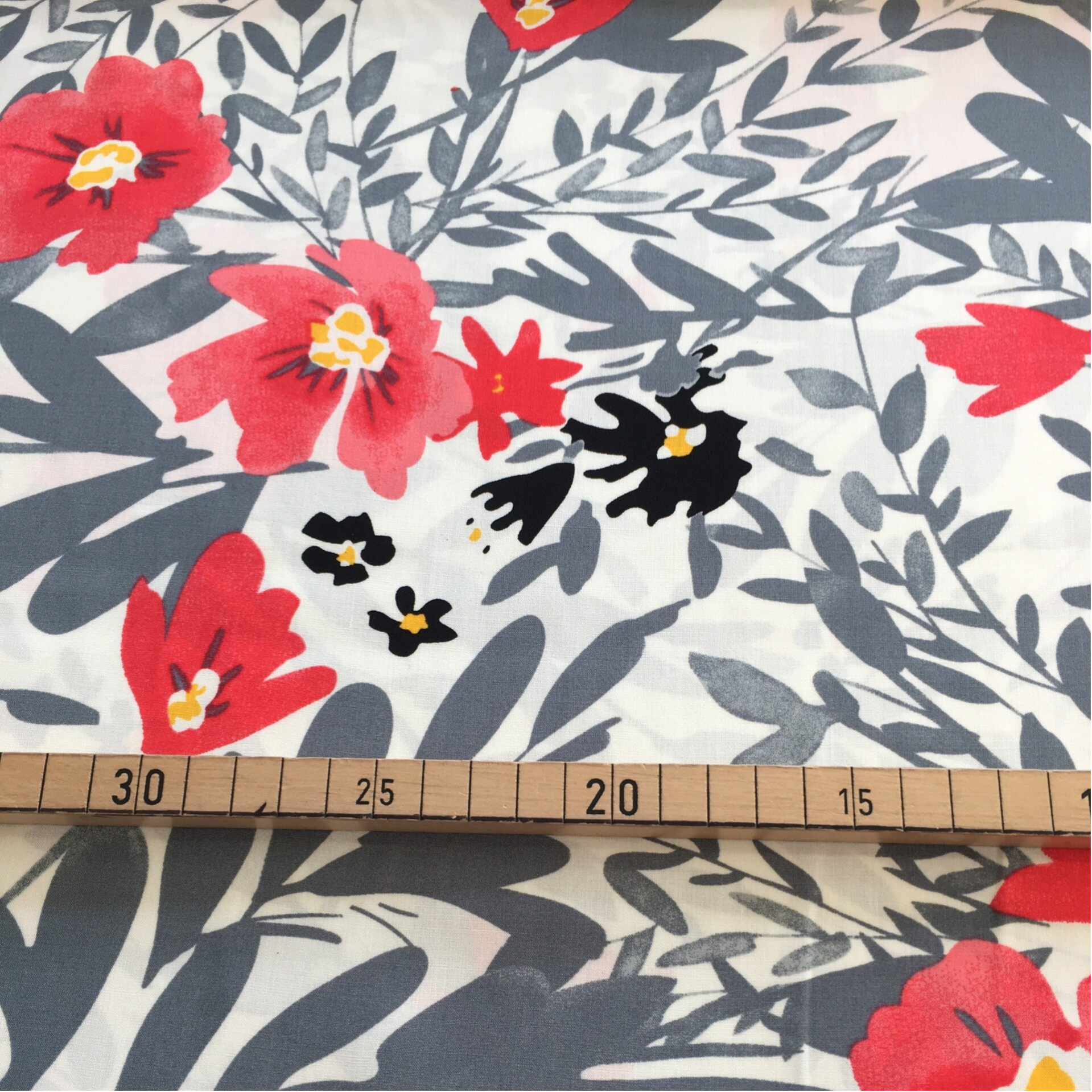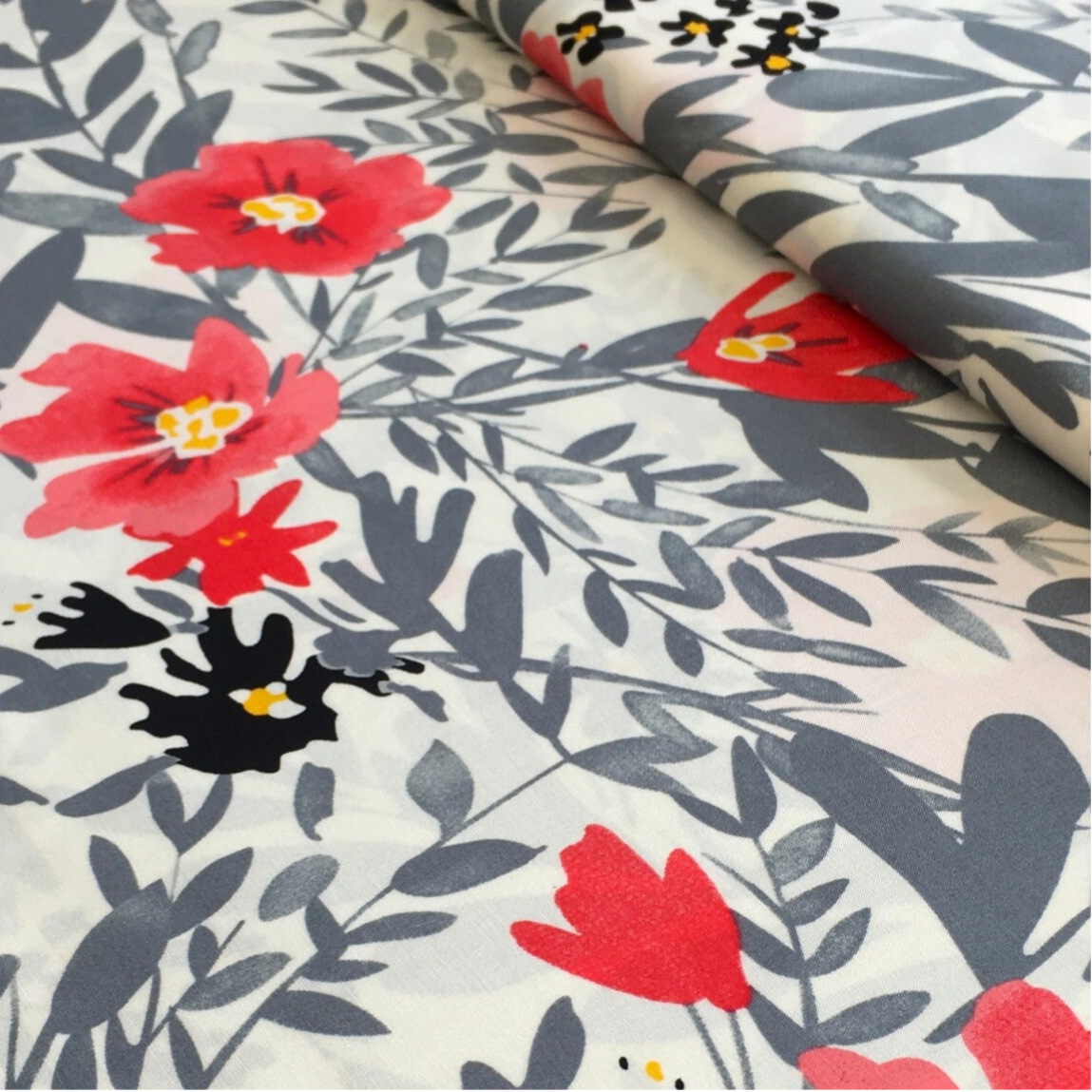 Cremegrundiger Viskosestoff mit Blumenmuster in grau, rot und schwarz.