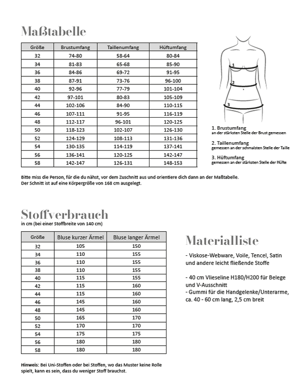 Ein leicht abgerundeter Saum im Rückenteil rundet die Bluse harmonisch ab. Das Papierschnittmuster ist für Damen in den Größen 32–58 ausgelegt und passt somit vielen Figurtypen.