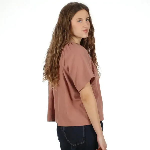 FRAU NOOR ist eine feminine, kurz geschnittene Sommerbluse, die durch ihren fließenden Stoff und ihre luftige Passform überzeugt. Das leichte Material sorgt für ein angenehmes Tragegefühl und macht die Bluse ideal für warme Tage. Der runde Halsausschnitt wird durch feine Kräusel, einen dekorativen Schlitz in der vorderen Mitte und ein zartes Bindebändchen stilvoll in Szene gesetzt. Die weit geschnittenen Raglanärmel verleihen der Bluse eine entspannte Silhouette und unterstreichen den sommerlich-leichten Look.