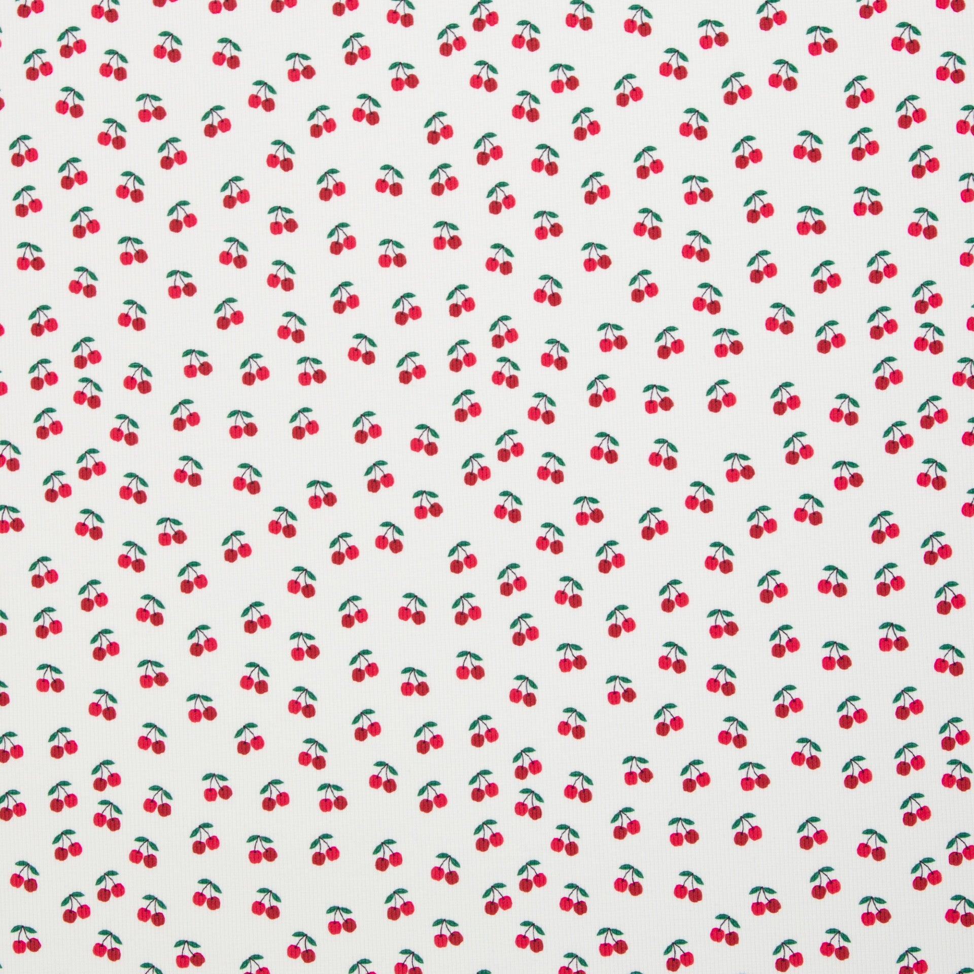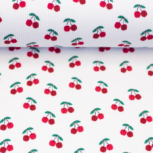 Dieser hochwertige Rippjersey mit Kirschenmuster auf weißem Grund überzeugt durch seine weiche Haptik, hohe Elastizität und angenehmen Tragekomfort. Der feine Rippstrick sorgt für eine flexible Passform und macht den Stoff ideal für eng anliegende Kleidungsstücke wie T-Shirts, Longsleeves, Kleider, Leggings oder Baby- und Kinderbekleidung.