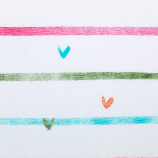 Baumwolljersey mit bunten Streifen und Herzen- ein weicher, elastischer Jerseystoff für vielseitige Nähprojekte. Das moderne Design kombiniert klassische Streifen mit verspielten Herzmotiven und eignet sich ideal für Kinderkleidung, Damenmode sowie Accessoires.